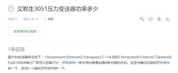國外的變送器排名如下:1.Rosemount-Emerson2.Yokogawa3.E+H4.ABB5.Honeywell6.Foxboro7.Siemens8.Fuji9.SMAR其它廠家可以忽略不計(jì),羅斯蒙特一家市場份額是后面8家份額的總和。在亞洲橫河還能和羅斯蒙特拼一下,歐洲E+H能和羅斯蒙特拼一下。