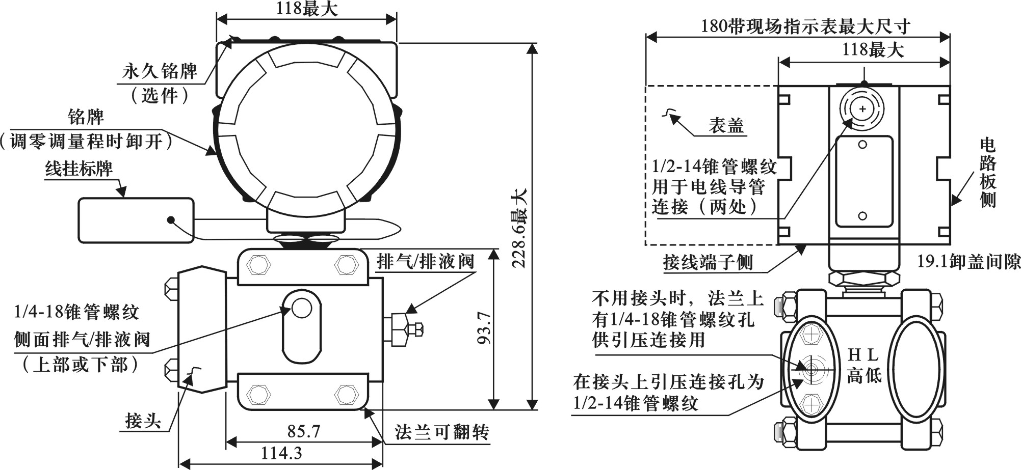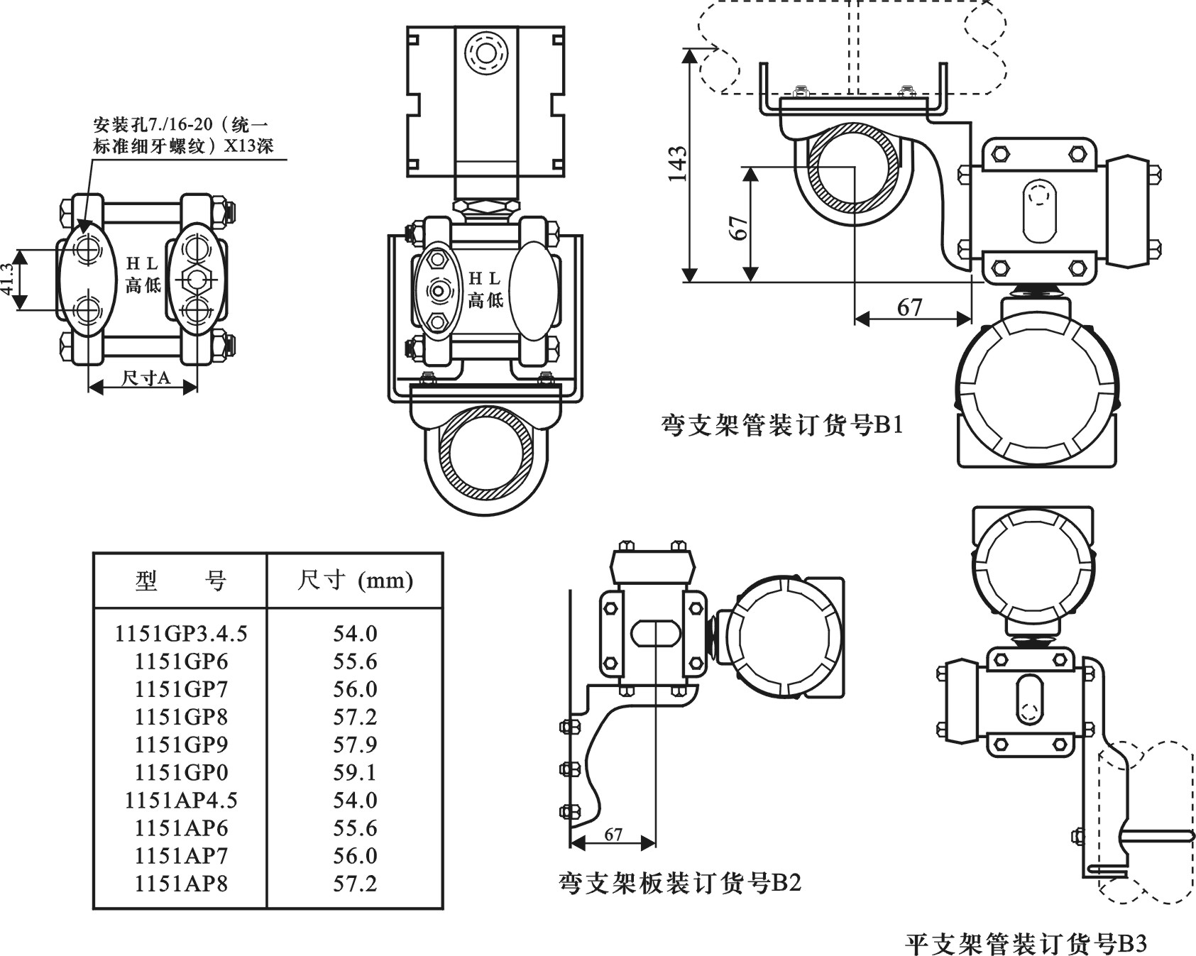 SLK1151GP電容式壓力變送器技術指標:遷移量:最大正遷移為最小調校量程的500%;最大負遷移量為最小調校量程的600%; 超壓極限:最程為200kPa以下的施加0(絕對壓力)~3.8MPa;6.89MPa以下的施加0(絕對壓力)~13.8MPa;量程為20.7MPa的施加0(絕對壓力)~31.4MPa;量程為41.3MPa的施加0(絕對壓力)~51.4MPa, 變送器無損壞,正常工作壓力高于3.4kPa(絕對壓力),法蘭可承受68.9MPa的壓力。 溫度影響:最大量程零點誤差:為量程的0.5%/55℃;最小量程零點誤差:為量程的3.0%/55℃ 安裝位置影響:最大可產生±0.25kPa的零點誤差,但可校正,對量程無影響。 結構尺寸: